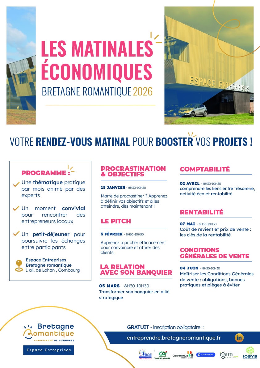 La Communauté de communes Bretagne romantique dévoile la programmation 2026 des Matinales économiques, des rencontres mensuelles destinées aux entrepreneurs du territoire, pour échanger sur des problématiques concrètes et développer leur réseau professionnel.
